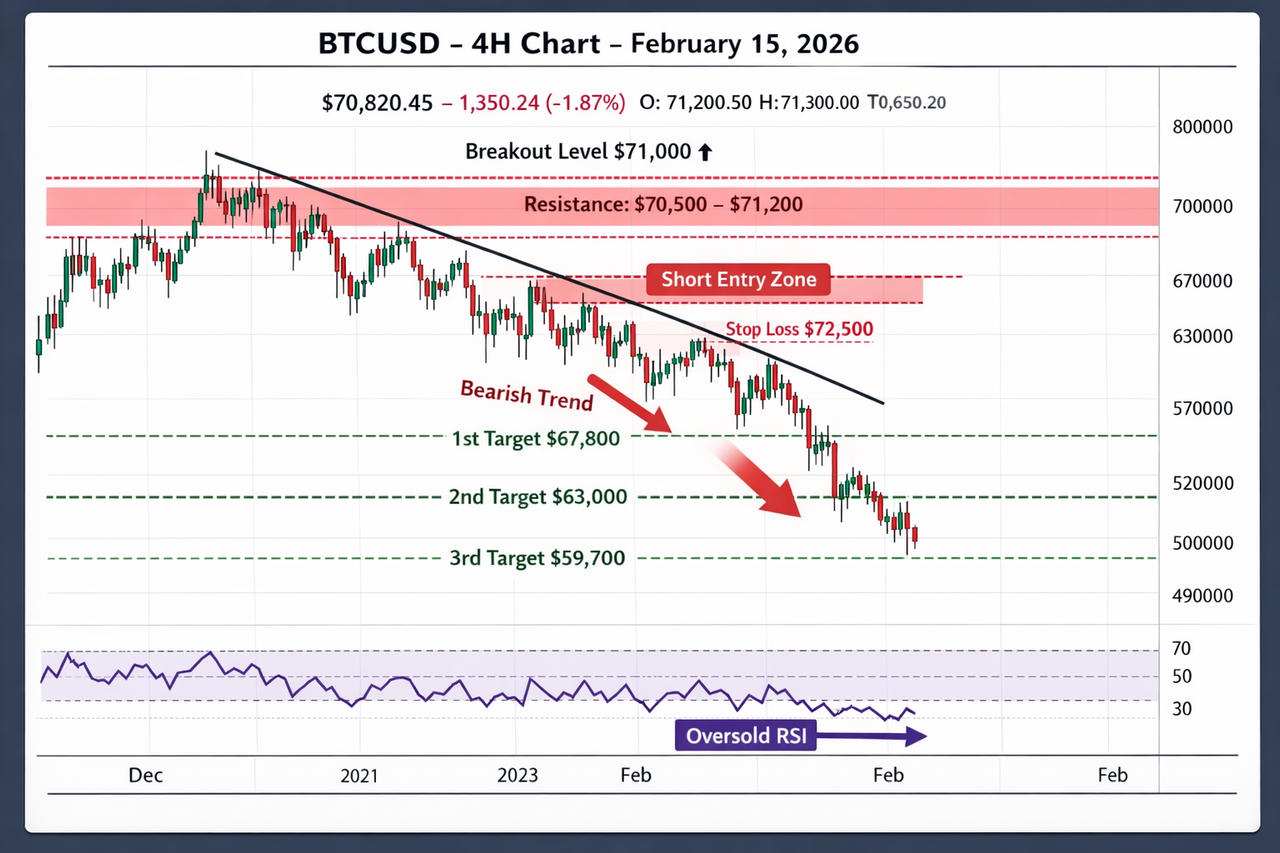 BTCUSD is currently trading around $70,800. The market has experienced significant volatility after dropping sharply from its 2025 highs near $126,000. Price action suggests continued pressure from macroeconomic factors and weakening sentiment.