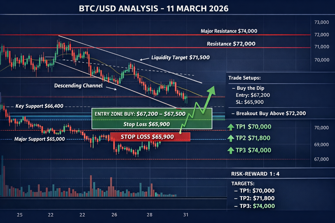 Bitcoin (BTCUSD) is currently trading within a major consolidation range between $65,000 and $74,000. The market has entered a compression phase after a strong rally, suggesting that a major breakout could occur soon.
