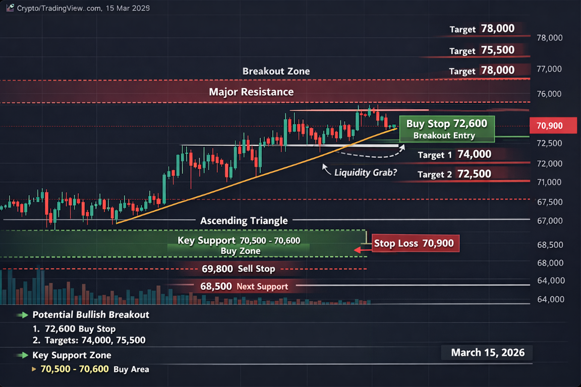 Ascending triangles often lead to bullish breakouts. A confirmed breakout above $72,500 could trigger strong upward momentum.