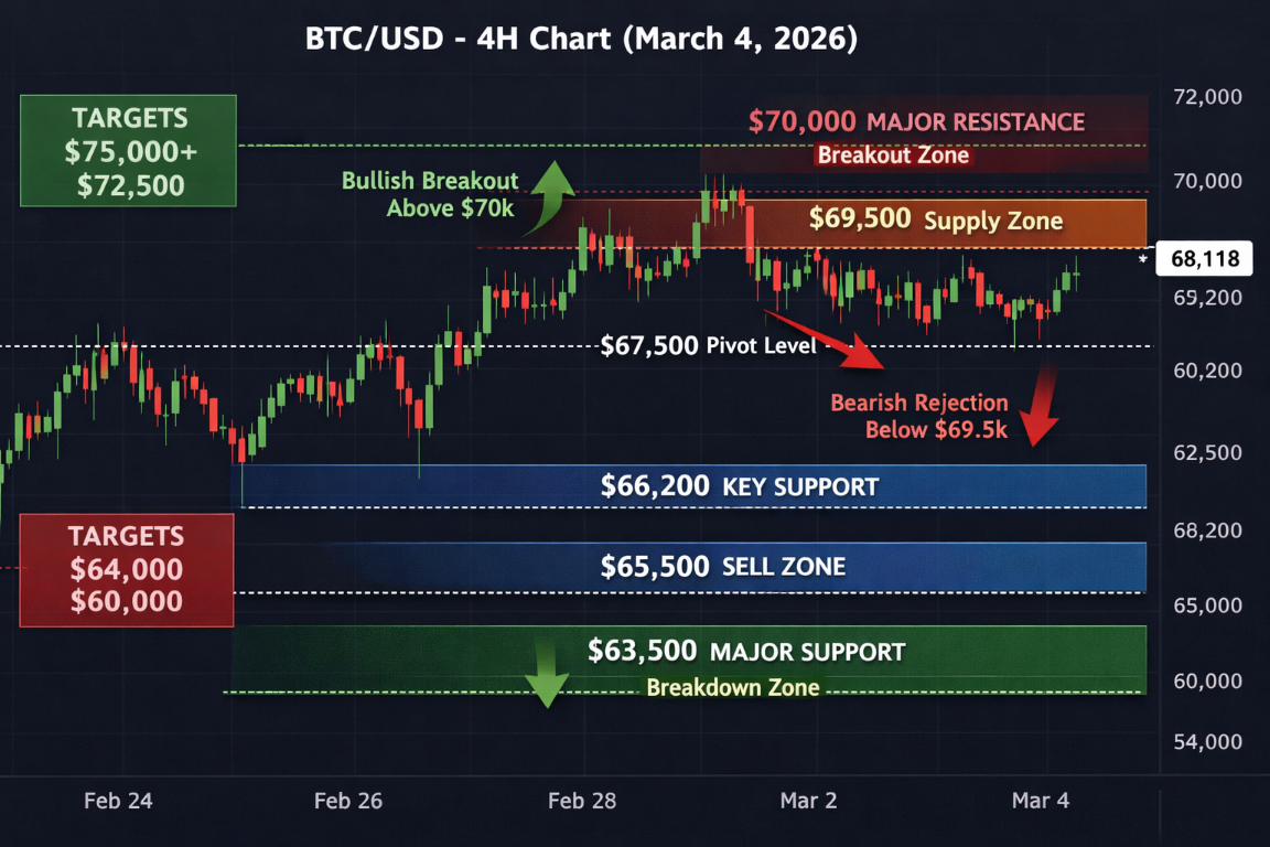 Bitcoin is currently consolidating within a major decision zone between $65K and $70K. The market is compressing and preparing for a strong directional move.